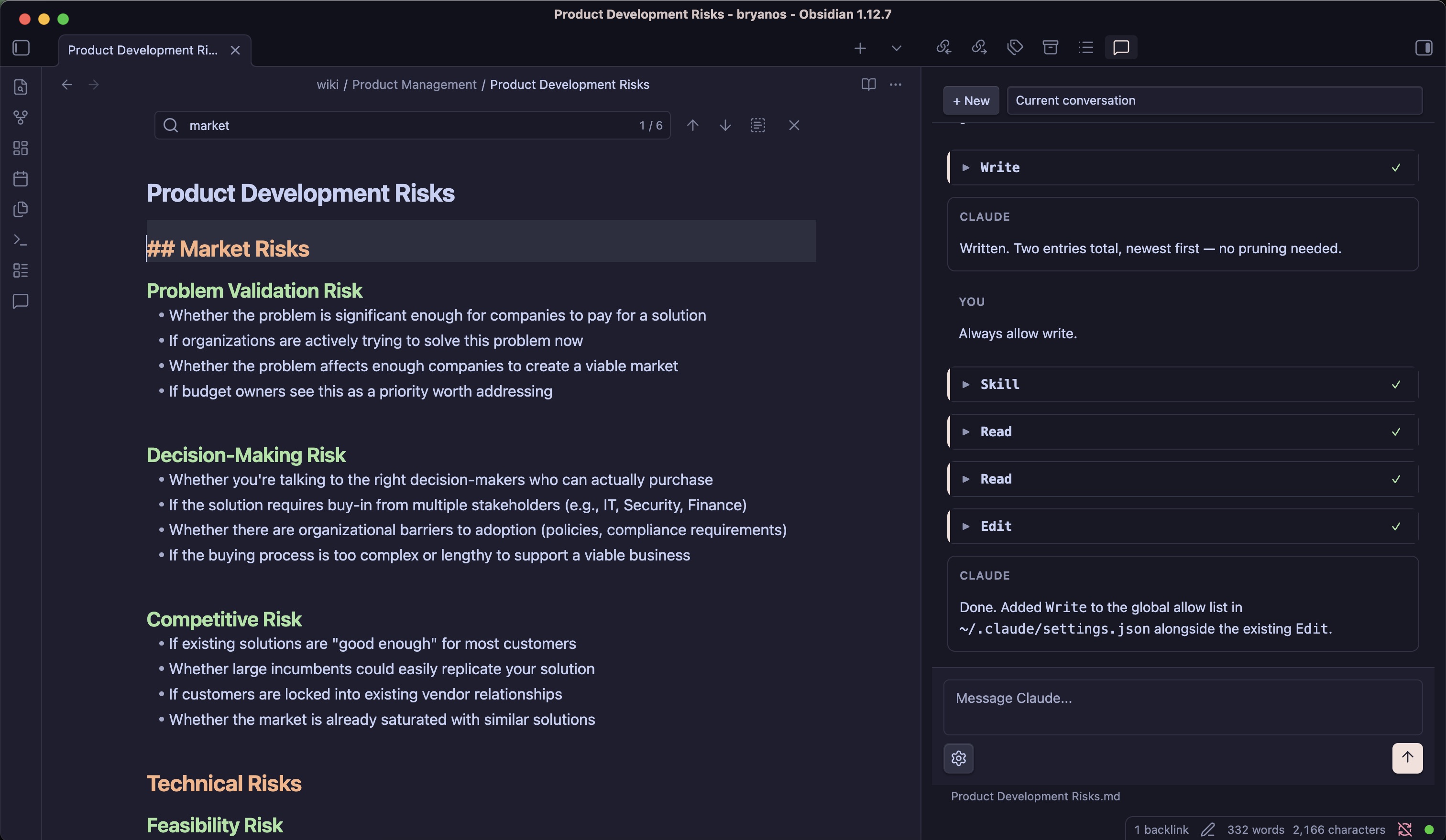 My workflow was mostly reading and typing in Obsidian, then asking questions and other interactions with Claude Code (CC). This is a very typical UX for developers using AI for coding. In VS Code, you’d have CC opened side-by-side with your code.
